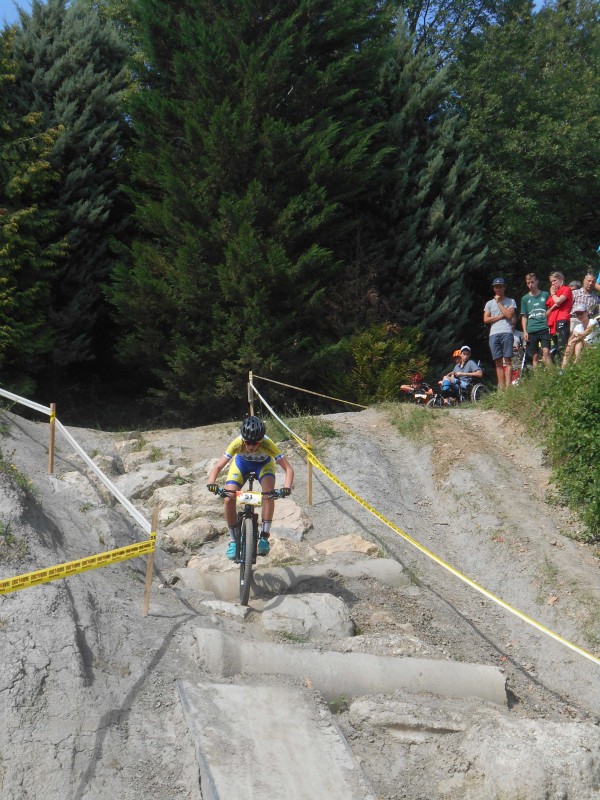 En minimes, Léo Favier prend un mauvais départ, pointant en avant-dernière position dès les premières chicanes. Il revient rapidement dans le trio de tête à la faveur des premiers pétards très raide du parcours. Au bout du premier tour, il est roue dans roue avec le premier et pointe à 1 seconde au passage sur la ligne. Dès la première grosse difficulté du parcours, une longue bosse à fort pourcentage, il attaque franchement et prend la tête de la course sur le deuxième tour.