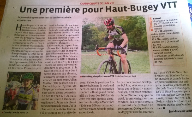 Chez les juniors Antonin LASSERRE qui fait une très belle saison en coupe Rhône-Alpes à les moyens lui aussi de décrocher une belle place sur le podium, même chose pour Baptiste DUBOIS qui fera son grand retour à la compétition à cette occasion. En espoir Florian CHAUVELIN va essayer de décrocher un troisième titre de champion de l'Ain, Erwin DEMKO et Alexandre ROUSSERO si ils sont presents pouraient eux aussi monter sur la plus haute marche du podium. Du côté des masters (1-2) Florian ALONZI qui avait été titré en 2012 si il confirme sa présence peut faire un bon résultat même si son entrainement actuel est plus ciblé sur de la longue distance en vue de la MB RACE. Du côté des dames Alice BOURGEOISAT peut confirmer son titre de l'année dernière. Chez les master (3-4) Daniel BERNARD a hésité avant de s'inscrire ( il lui reste encore des traces de sa chute en coupe de France à Lons) ; mais Daniel est bien inscrit et il fera son possible pour aller se confronter à ses copains du HB VTT : Xavier PERRAULT ( champion en titre) et Philippe BASSET un habitué du XC.
