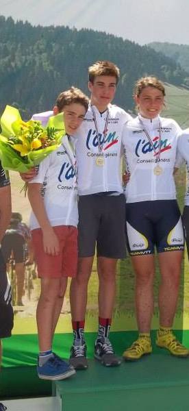 En cadet Maxime BARBARIN revenait à la compétition après une coupure de deux semaines. En tête lors du start loop, maxime va se faire passer  sur la grande boucle par Louis BALTHAZAR du team materiel velo . Maxime termine deuxième au scratch mais conserve son titre de champion de l’Ain . Le voilà avec un nouveau maillot. Maxime va maintenant se préparer pour les prochaines échéances de Juin et Juillet . En cadet toujours Mathier JACQUETAND a fait une belle course puisqu’il décroche une belle cinquième place. Son assiduité sur les coupe Rhône-Alpes a été une très bonne chose, cette cinquième place le démontre. En junior fille Lauraly ROCHE après une course en tête décroche un nouveau titre de championne de l’Ain. Lauraly qui revenait du championnat de France de  Duatlhon à Xonrupt dans les Vosges avec ses copains du Lycée Xavier Bichat de Nantua ( 3 ème place au championnat de France UNSS excellence) a trouvé les forces pour aller décrocher ce nouveau maillot. Bravo Laly.