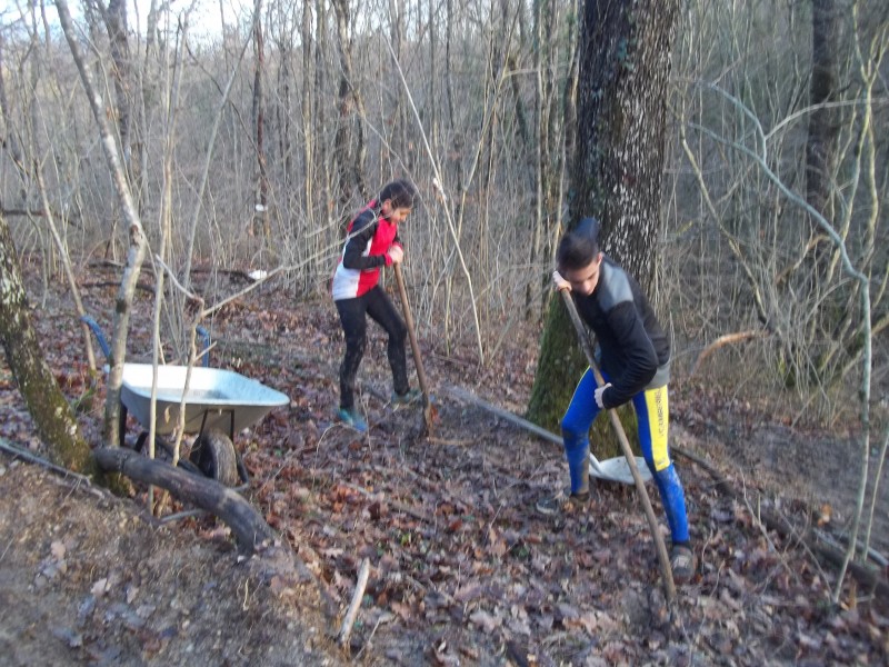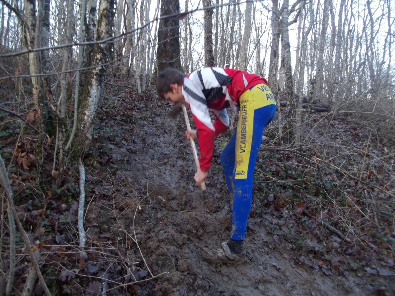 En effet, 5 jeunes vététistes du club, très motivés (Matthieu, Benjamin, Loris et les deux Alexandre) encadrés par Daniel, Didier et Alain, n'ont pas ménagé leurs efforts pour peaufiner les virages du circuit en sous-bois destiné aux futurs entraînements de l'école VTT et du team VTT VCA.