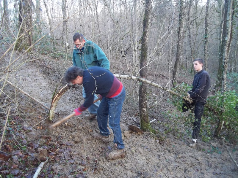 Malgré les pluies incessantes tombées la veille qui ont bien détrempé le terrain, les travaux ont repris ce samedi après-midi dans les bois des Brosses à Ambérieu.