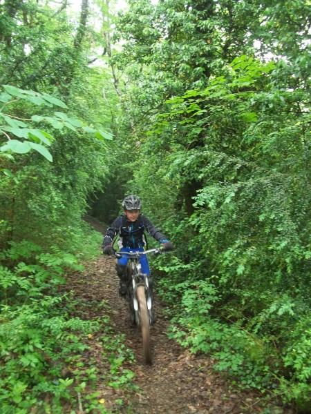 Puis dernière descente depuis les pâturages du Mont jusqu'au Bévieur, par un single dans les bois comprenant quelques passages très techniques. C'est d'ailleurs en essayant de franchir l'un d'eux que Daniel fit une mauvaise chute et se fit une plaie à l'arcade sourcillière sans doute avec ses lunettes. Après desinfection de la plaie et un stérilstrips pour recoller tout ça, il put repartir mais resta un peu secoué par ce choc. Il en sera quitte pour un voyage aux urgences après l'entraînement, pour se faire mettre quelques points de suture.