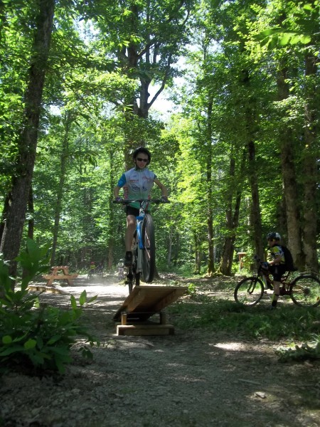 Compte-tenu de la chaleur, le groupe commença par un échauffement sur un circuit aménagé dans la partie plate du parc de Merland avec différents modules en bois fournis par Anima-Bike (serpents, tremplins, bosses simples et doubles, pyramide, bascule, passerelle rétrécie, etc)